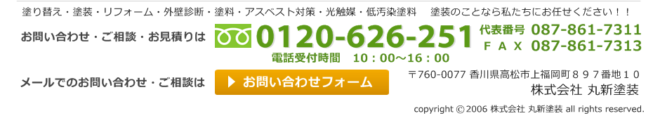 お名前とE-Mailアドレスは、丸新塗装よりお問い合わせいただいた内容へのお返事を送らせて頂くために必須項目になっております。必ずご入力下さい。
