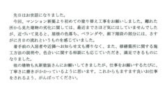 三月中旬、塗装着手前のご近所へのご挨拶、入居者へのお知らせから翌日の仕事の内容など20枚を越えるお知らせ文を各入居者にして頂き、とても安心してお任せすることができました。